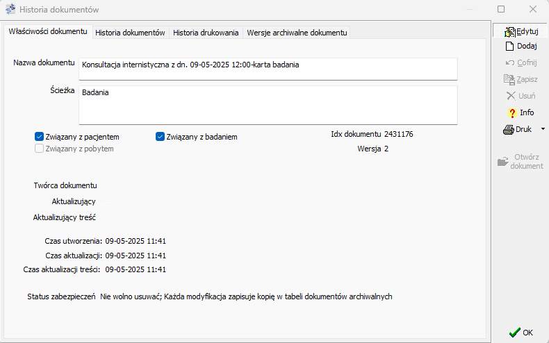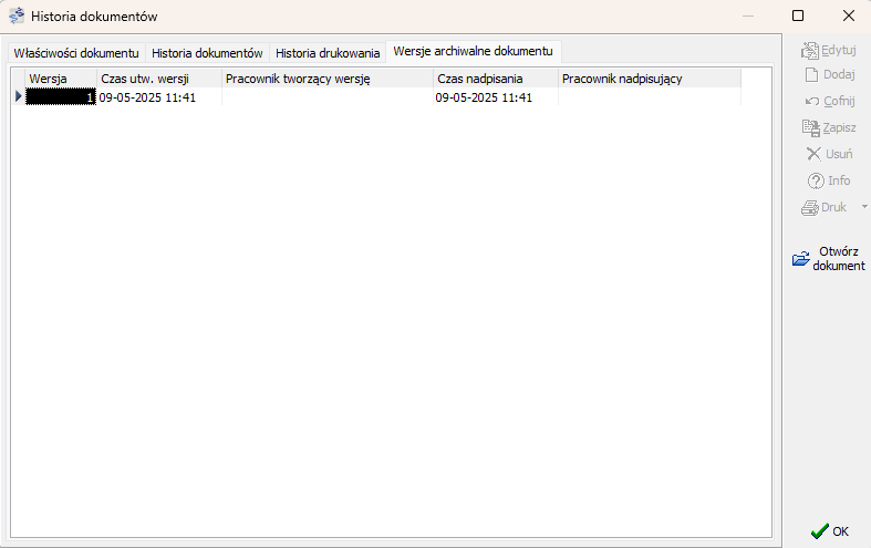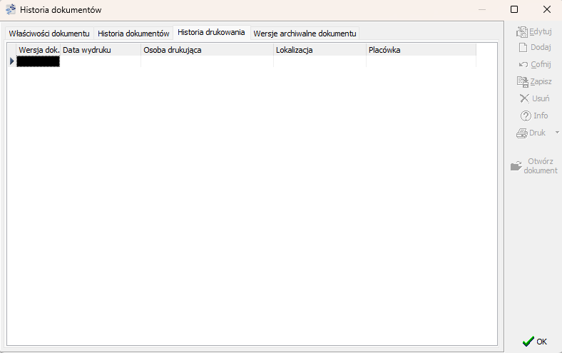 Historia dokumentów zawiera właściwości dokumentu, historię wersji oraz historię jego drukowania a także umożliwia dostęp do wersji archiwalnych dokumentu.