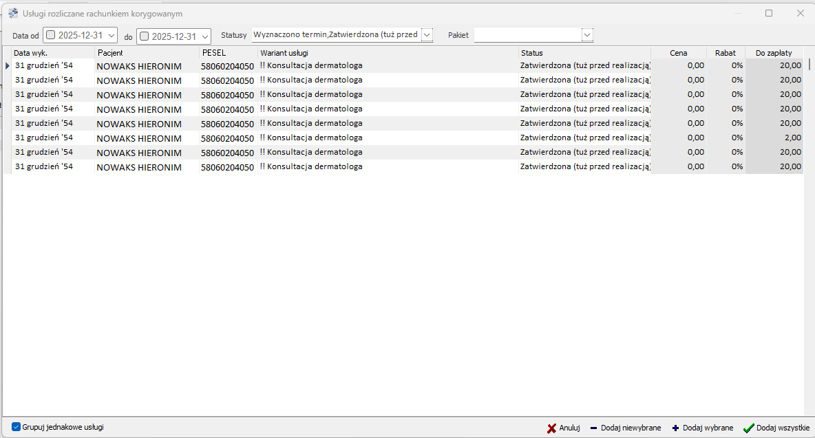 Aby tylko utworzyć korektę częściową - w sytuacji gdy chcemy skorykować cenę 1 z kilku usług na badaniu należy podczas dodawania korekty wybrać opcję "Usługi z rach.koryg."