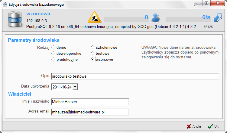 - Właściciel - imię i nazwisko oraz adres email właściciela środowiska.
