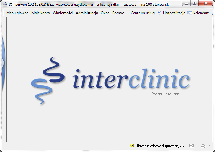 Informacje o rodzaju środowiska innym niż produkcyjne prezentowane są na ekranie głównym systemu InterClinic w postaci napisu usytuowanego w dolnej części centralnie położonego logo systemu.